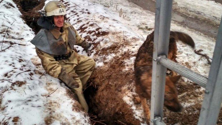 В Покрове на Днепропетровщине пять спасателей доставали из траншеи собаку.
