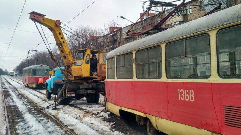 Точную причину в КП ‘Днепровский электротранспорт’ не назвали. С рельс ‘слетела’ одна из колесных пар. Проблема в рельсах или в трамвае неизвестно.