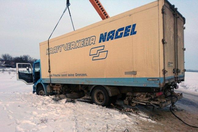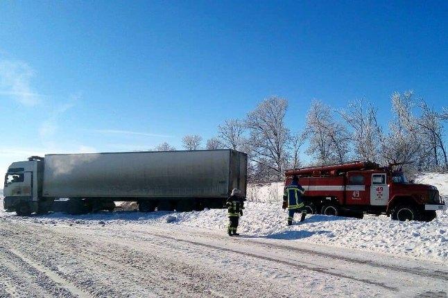 По прибытию к месту вызова, сотрудниками 41 государственной пожарно-спасательной части Главного управления ГСЧС Украины в Днепропетровской области, с помощью буксировочного троса, грузовик был отбуксирован к участку дороги, очищенной от снега.