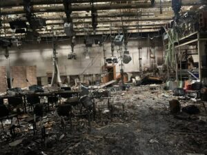 У Дніпрі триває ліквідація наслідків нічної атаки на Дніпро. На місцях влучань та в районі пошкоджених будівель працюють комунальники. Також триває обстеження приміщень, забивка вибитих вікон плівкою та прибирання уламків.