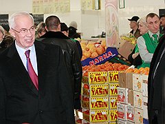 Кортеж Николая Азарова в сопровождении автомобиля ГАИ приехал около 14.00, нарушив правила дорожного движения, запрещающие въезд на улицу Панаса Мирного со стороны улицы Кутузова. В супермаркете господин Азаров первым делом направился в отдел овощей и фруктов. Его сопровождала менеджер торгового зала Оксана Майданова, а удивленные покупатели фотографировали премьера на мобильные телефоны.