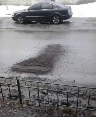 Конечно же, через несколько часов машины снова выбили ‘заплатку’ из ямы, а от ремонта не осталось и следа.