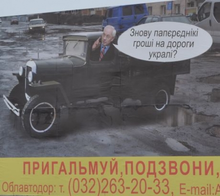 Азаров обратился к жителям Львовщины: Знову папєрєдніки гроші на дороги укралі?. ФОТОМестные активисты разместили соответствующий коллаж на рекламном щите на обочине дороги.