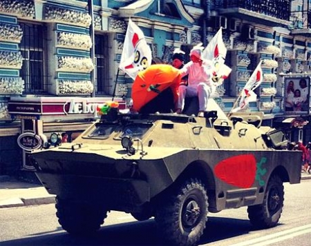Перед колонной оппозиции выехал бронетранспортер, на котором были нарисованы большие морковки, сверху также была прикреплена большая морковка, а сверху на БТРе сидел человек в костюме кролика. Кроме того, перед колонной оппозиции выбежала группа провокаторов с транспарантами ‘Любовь морковь’. Провокаторов было около 20 человек, при этом около половины из них составляли девушки, одетые как монашки.