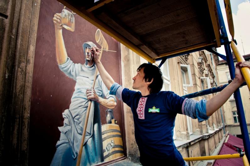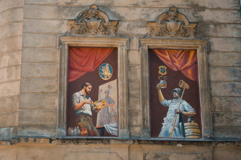 На днях во Львове завершился красочный социально-культурный проект ‘Окна в прошлое’. На протяжении недели художники из разных уголков Украины создавали на каменных фасадах старого города картины из жизни цеховых мастеров 17-18 веков. Благодаря этому львовяне и гости города могут не заходя в музей, прямо на улице города познакомиться с предметами быта и атрибутикой пивоваров, портных, пекарей, кузнецов, бондарей, купцов, шорников, мечников, маляров и музыкантов, живших и работавших во Львове несколько веков назад.