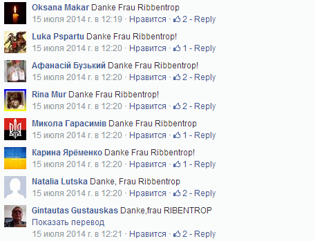 Как сообщалось, на странице Ангелы Меркель в Фейсбуке пользователи массово оставляют комментарии ‘Благодарю, госпожа Риббентроп’ (Danke, Frau Ribbentrop). Подобные сообщения присутствуют и на странице ХДС в Фейсбуке. Такой флешмоб, очевидно, мог стать ответом на встречу Меркель с российским президентом Владимиром Путиным в прошлое воскресенье в Рио-де-Жанейро, после которой они призвали к проведению прямых переговоров между украинским правительством и сепаратистами.