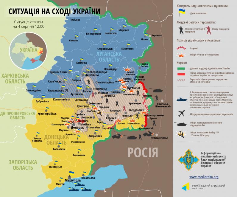 Восток 4 августа (Карта)Подразделения сил АТО заняли город Ясиноватая Донецкой области, который является важным пунктом железнодорожного сообщения региона.