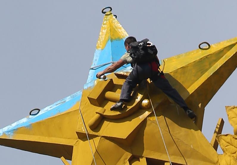 ‘Вчера соцсети в очередной раз были повергнуты в уныние сообщением Рус лжеТВ, о том, что Россия объявила в международный розыск Ушевца Павла Игоревича, он же руфер Мустанг. Это тот самый Герой Украины, который, взобравшись на одну из сталинских высоток в Москве, сам, один, за ночь раскрасил звезду, венчавшую шпиль, в цвета украинского национального флага и сделал фото, облетевшее весь мир! Этим он поверг в большое уныние Кремль и одурманенных пропагандой москвичей ‘, – пишет он.