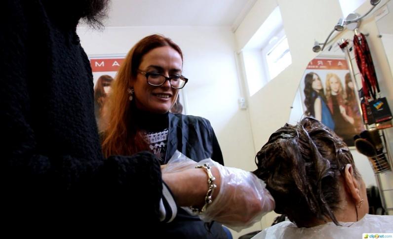 Екскурсію новою перукарнею нам проводить вже Євгенія. Вона,звичайно, радиться з чоловіком, але все облаштовує на свій смак. Центральна зала з високим, схожим на вуличний, ліхтарем, косметологічний кабінет. В іншому залі ще багато пакунків тут Носачі планують проводити професійне навчання. У розпал робочого дня відвідувачів ще не дуже багато, але всі при роботі.
