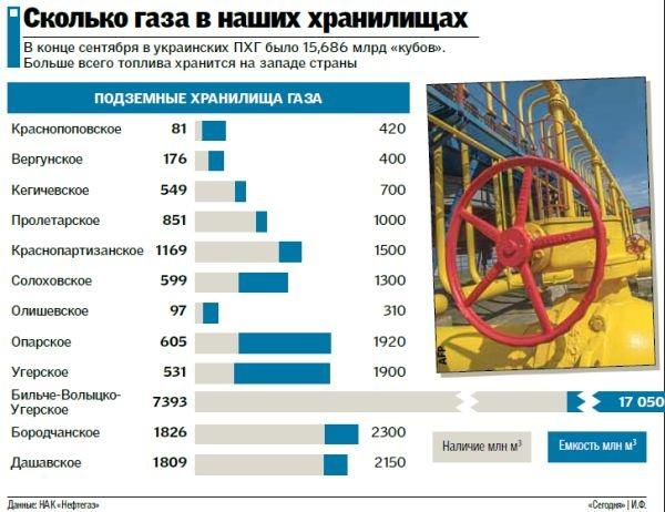 ЗАПАСЫ. Для того чтобы нормально пройти отопительный сезон, Украине необходимо, по оценкам экспертов, не менее 28 млрд кубов. При этом, по данным НАК ‘Нефтегаз’, в начале октября в подземные хранилища было закачано 15,8 млрд кубов (см. инфографику). То есть, по мнению экспертов, на старт отопсезона, который традиционно приходится на 15 октября, Украина сможет накопить в ПХГ до 16,5 млрд кубов газа. ‘В принципе, этого достаточно для начала отопсезона но при условии, что мы будем и дальше закупать газ. В условиях умеренной зимы, с октября по апрель, Украина потребляет около 28 млрд кубов (на отопление и на нужды производства). Около 10 млрд кубов наша страна получает за счет собственной добычи, а еще 11,5 млрд кубов можно использовать из ПХГ, так как 5 млрд кубов буферный газ, который нельзя изымать из хранилищ. Таким образом, на зиму нам не хватает около 6,5 млрд кубов газа’, посчитал сопредседатель Фонда энергетических стратегий Дмитрий Марунич.