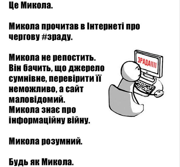 ‘Николай прочитал в интернете про очередную ‘зраду’. Николай не репостит. Он видит, что источник сомнительный, проверить его невозможно, а сайт – малоизвестный. Николай знает, что идет информационная война. Николай умен. Будь, как Николай’, – призывают в Генштабе.