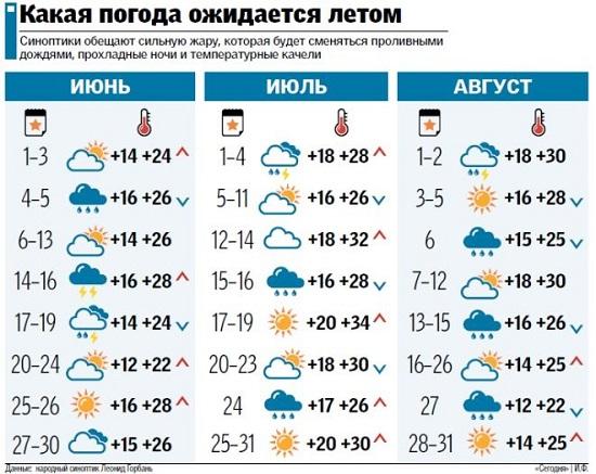 ИЮНЬ. Замначальника Гидрометцентра Анатолий Прокопенко говорит, что июнь ожидается традиционным с короткими грозовыми дождями и температурой не выше +30 днем. Такую же погоду предсказывают и метеосайты: по их расчетам, короткие грозовые дожди пройдут каждые день-два. Именно из-за них весь месяц температура днем не будет подниматься выше +28. Мартазинова и Горбань считают, что дождей все же будет меньше. Так последний сулит сильные грозы (1417 мм осадков) лишь в середине месяца и небольшой дождик в первые июньские выходные. В остальные дни будет солнечно и сухо.