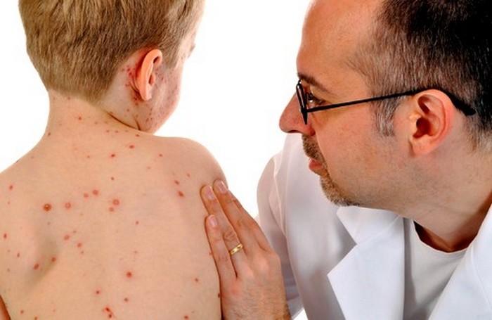 На 4-5 день болезни появляется красная сыпь, который начинается с кожи головы и лица, а затем распространяется на все тело. Болезнь с симптомами длится до четырех недель и более.