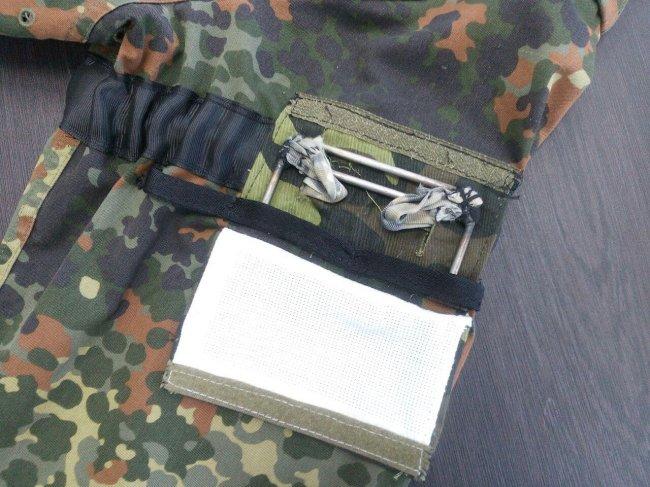 ‘Иногда на одну конечность нужно наложить несколько бинтов. Он же анатомически продумал места применения жгутов, вшив их в плечевые части рук и верхние части бедер. Все просто: открываешь клапан, достаешь фиксирующее устройство, движением руки перетягиваешь руку бойца и вставляешь клапан в фиксирующее положение. Сюда же боец должен записать время наложения жгута’, рассказывает Александр Коломийцев, отмечая, что подобная форма есть в армиях некоторых стран, однако носят ее лишь бойцы спецподразделений.