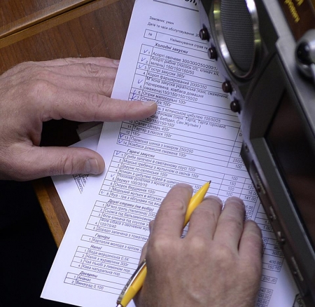 На фотографиях виден бланк меню, на котором депутат галочками отмечает, видимо, то, что будет заказывать. Делает это регионал прямо на своем месте в сессионном зале Рады.